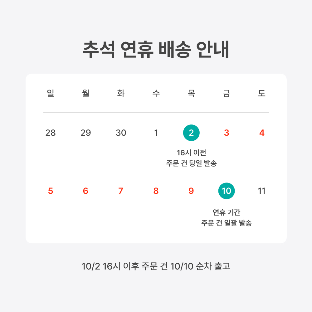 2. 16:00 이전 주문건은 당일 배송되며, 이후 주문건에 대해서는 익일 순차적으로 발송됩니다.